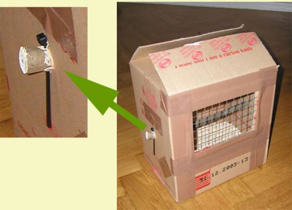 Diese Transportbox wurde von Petra gebaut. In einen Pappkarton wurde ein Fenster geschnitten. Darüber wird von außen Draht angeklebt. Eine Sitzstange lässt sich mittels Kabelbindern anbringen. Diese Kiste eignet sich nicht für starke Knabberattacken, ist für kurze Transporte aber eine ideale, billige Lösung. Noch besser sind Transportkäfige, die von der Seite oder von unten zu öffnen sind. Denn die Vögel können beim Einsetzen nicht so schnell entkommen. Kleine Wellensittichkäfige sind in Auktionshäusern oft schon für wenige Euro zu bekommen. Wie bekommt man nun die Vögel in den Transportkäfig?