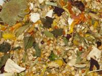 Kräuter: Vogelmiere, Fenchel, Lavendel, Blüten, Brennessel, Thymian, Pfefferminz, Salbei, Spitzwegerich, Hirtentäuschel, Löwenzahn, Schafgabe, Kamille, Gänseblümchen, Brunnenkresse, Eukalyptus, Ringenblume, Sonnenblumenblätter, Dill. Diese Mischung wird komplett kaum gefressen. Sie eignet sich jedoch sehr gut als Ergänzungsfutter oder um die normale Mischung abwechslungsreich zu erweitern.