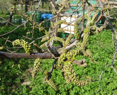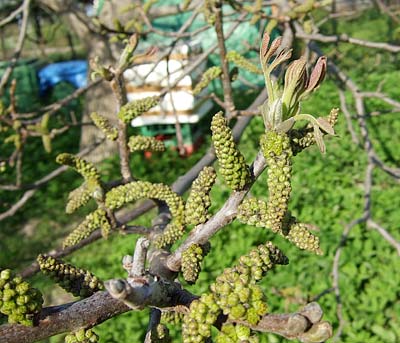 Die Echte Walnuss (Juglans regia) ist ein sommergrüner Laubbaum, der bis zu 25m hoch wird. Die Krone wächst sehr breit, aber nur mäßig verzweigt. Die Walnuss wird 120 bis 160 Jahre alt, in seltenen Fällen bis zu 600 Jahre. Die wechselständigen Blätter sind mit fünf bis neun Fiederblättern gefiedert und werden bis zu 40cm lang. Die Fiedern sind eiförmig bis elliptisch und bis zu 15cm lang. Die Blätter sind dunkelgrün glänzend. Die Blüten der Walnuss sind unscheinbar und einhäusig eingeschlechtlich, auf einer Pflanze gibt es also weibliche und männliche Blüten. Die Männlichen Kätzchen werden im Herbst angelegt und überwintern als Knospen. Im Frühjahr bilden sich daraus bis zu 15cm lange gelbgrüne Kätzchen.