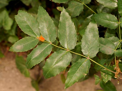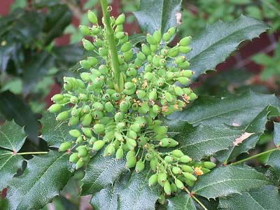 Die Mahonie ist eine immergrüne Strauchart aus der Familie der Berberitzengewächse (Sauerdorn). Sie kann als Heckenpflanze bis zu 2m hoch wachen. Die harten Blätter haben eine glänzende Oberfläche und gezähnte Blattränder. Im Herbst verfärben sich die Blätter rötlich. Erst im nächsten Frühjahr, wenn die neuen Blätter sprießen, fallen die alten langsam ab.