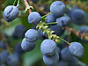 Die gelben Blüten bilden aufrechte Trauben. Die blauen erbsengroßen Beeren sehen bereift aus. Sie schmecken sehr sauer, haben rotes Fruchtfleisch und zwei bis fünf Samen.<b>ACHTUNG!</b>Verwechslung mit der giftigen Stechpalme möglich.
