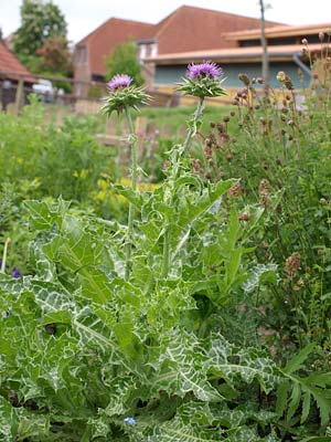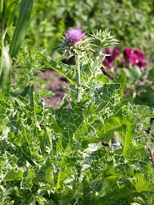 Mariendistel<br/> Synonyme: Frauendistel, Milchdistel, Krone Christi, Fieberdistel, Heilandsdistel, Marienkörner, Stechkörner