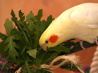 Die grünen Blätter werden von vielen Vögeln gern gefressen. Schlaffe Blätter kann man einige Minuten in Wasser legen. Bei zu großer Aufnahme besteht die Gefahr, dass Durchfall (Polyurie) auftritt. Dies liegt vor allem am hohen Wassergehalt, ist ungefährlich und nach kurzer Zeit wieder vorbei. Rucola ist sehr nitrathaltig. Deswegen sollte er im Winter (Treibhausware) möglichst nicht angeboten werden und sonst möglichst nur Bio-Ware verwendet werden.