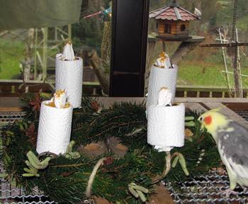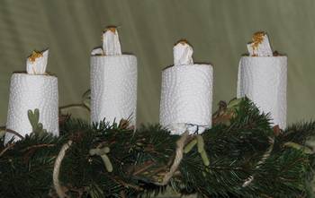 Für die Kerzen habe ich einfach Papprollen mit Küchenrollenpapier umwickelt. Dabei habe ich an der Unterseite der Papprolle das Papier wie bei einem Bonbon zusammengedreht und es unter das Seil des Kranzes geklemmt und dann einfach die Rolle zurechtrücken. Oben wird das Papier einfach in die Rolle hineingesteckt und eine „Flamme“ geformt. Mit einer Schere kann man sie noch etwas spitzer zulaufen lassen. Für die Deko kann man einfach seine Phantasie spielen lassen bzw alles verwenden, was man für die Flauschis gerade zu Hause hat. Bei mir gab es weihnachtliche Anissterne und Ahornsamen. Die einzelnen Kerzen habe ich oben einfach mit verschiedene Beeren gefüllt und als „Flamme“ Ringelblumenblüten verwendet.