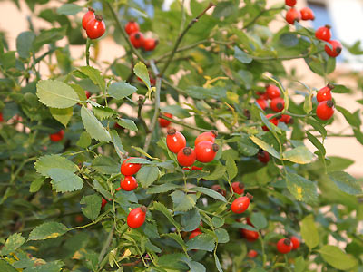 Vor allem in Gärten/Hecken, es gibt aber auch wild wachsende Hagebutten.