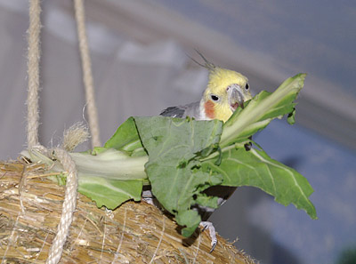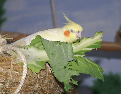 Die frischen fleischigen Blätter und die weiße Blüte.Im Gegensatz zu normalen Kohl kann er wie Brokkoli und Kohlrabi an Nymphensittiche verfüttert werden. Er kann sowohl roh, als auch ohne Salz gekocht angeboten werden.